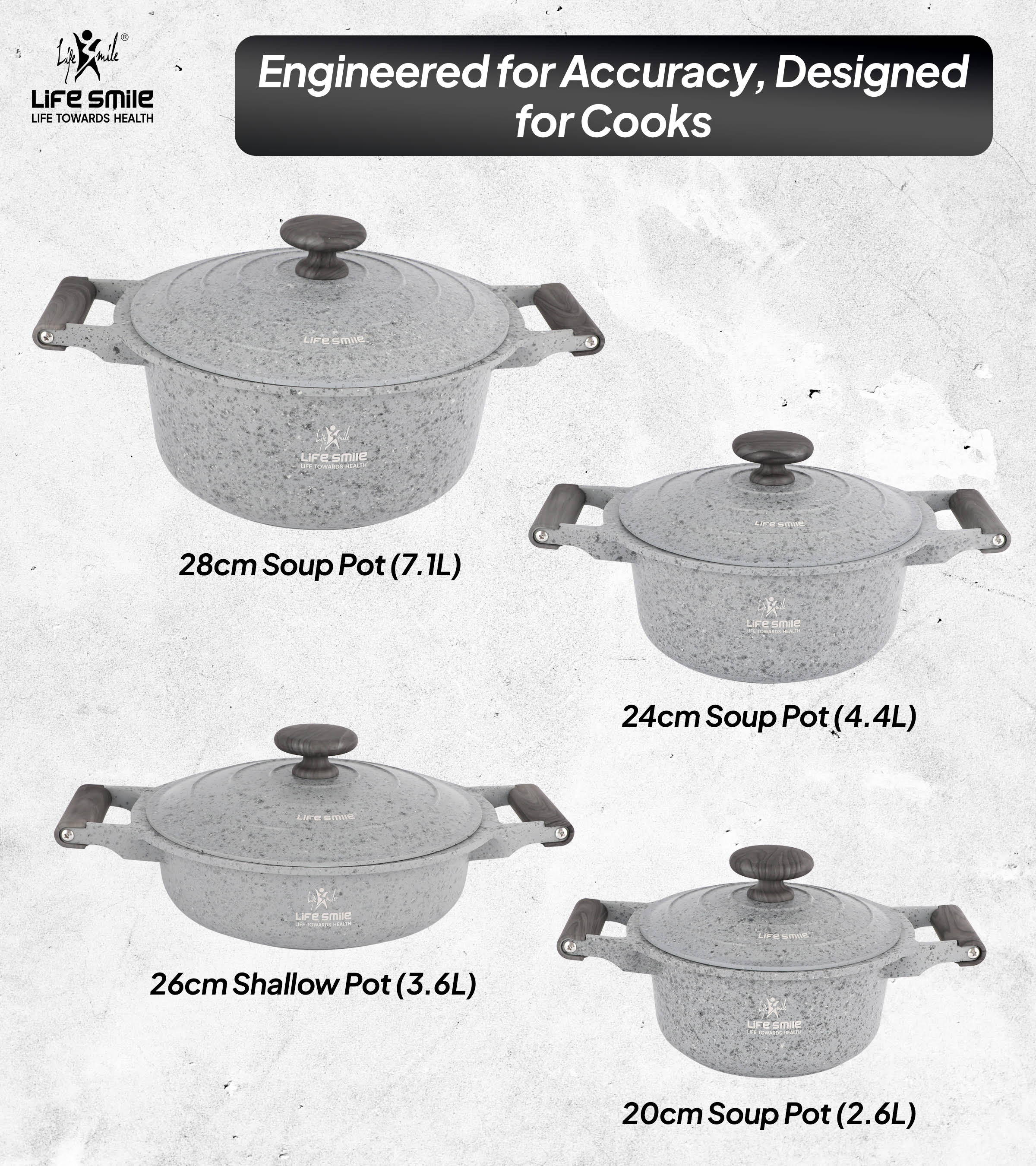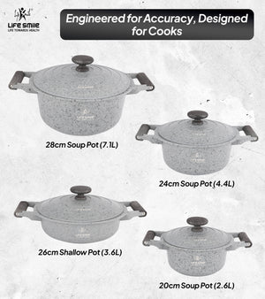 - Set Includes: 20 cm (2.6 L), 24 cm (4.4 L), 28 cm (7.1 L) Cooking Pots and 26 cm (3.6 L) Shallow Pot.